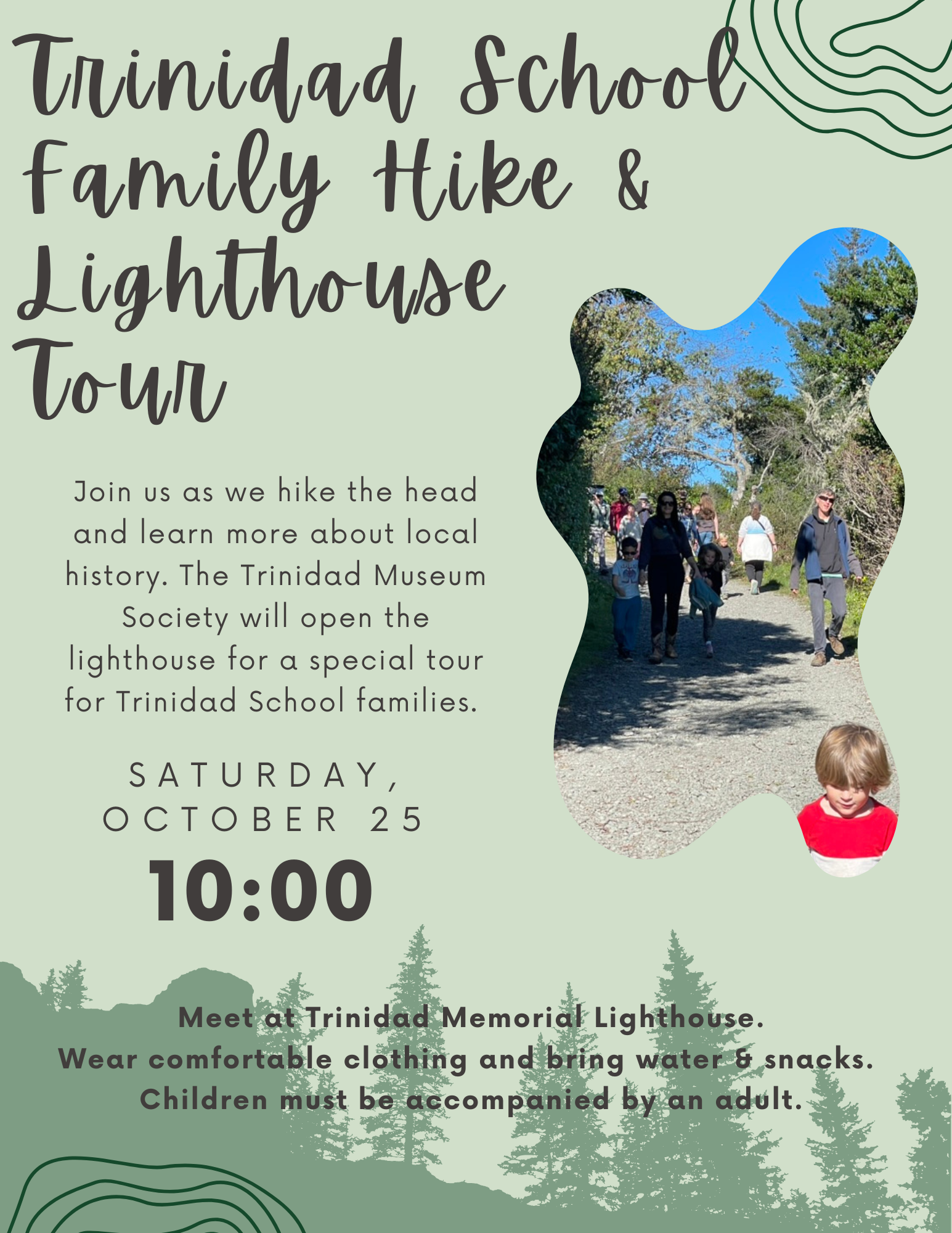 Family Hike on Saturday! Join us for a Dragon Family Hike on Saturday at 10:00am. We'll meet at the Trinidad Memorial Lighthouse and hike Trinidad Head. Kids must be accompanied by an adult.